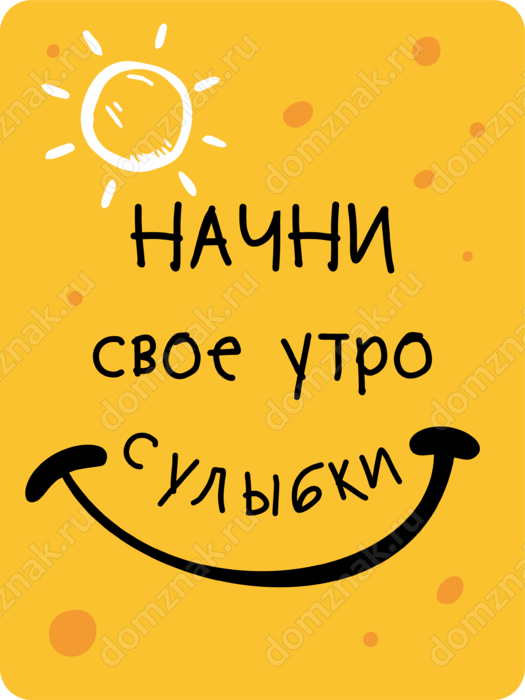 Табличка «Начни свое утро с улыбки» изготовлена из пластика ПВХ, толщиной 4 мм. Изображение наносится по технологии УФ-печати. Табличка предназначена для использования как в помещении, так и на улице.