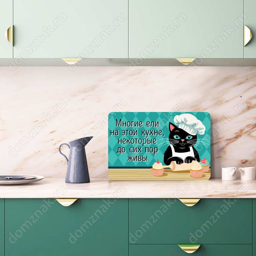 Табличка «Многие ели на этой кухне, некоторые до сих пор живы» изготовлена из пластика ПВХ, толщиной 4 мм. Изображение наносится по технологии УФ-печати. Табличка предназначена для использования как в помещении, так и на улице.