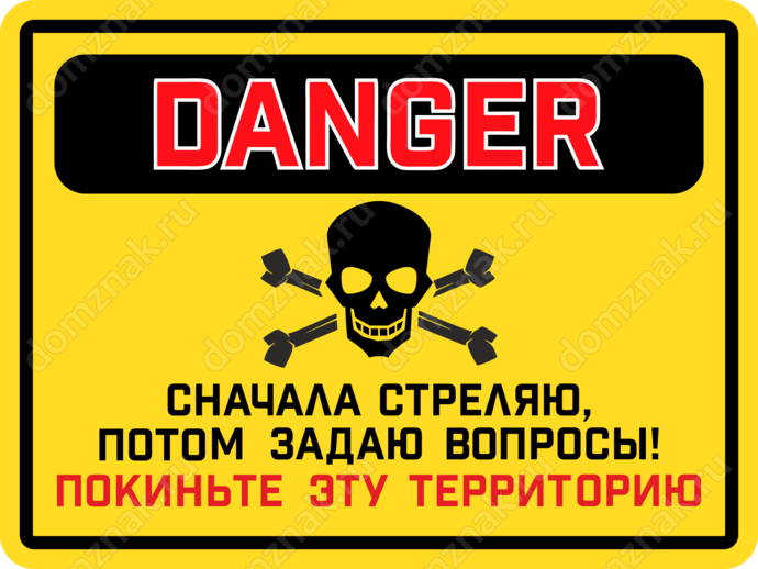 Табличка «Сначала стреляю, потом задаю вопросы! Покиньте эту территорию» изготовлена из пластика ПВХ, толщиной 4 мм. Изображение наносится по технологии УФ-печати. Табличка предназначена для использования как в помещении, так и на улице.