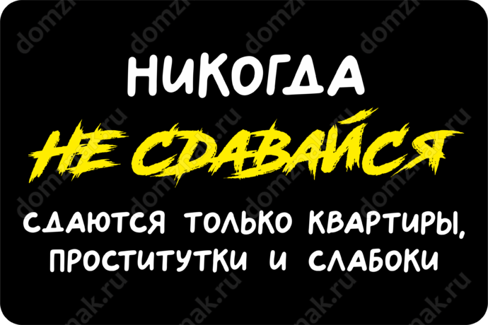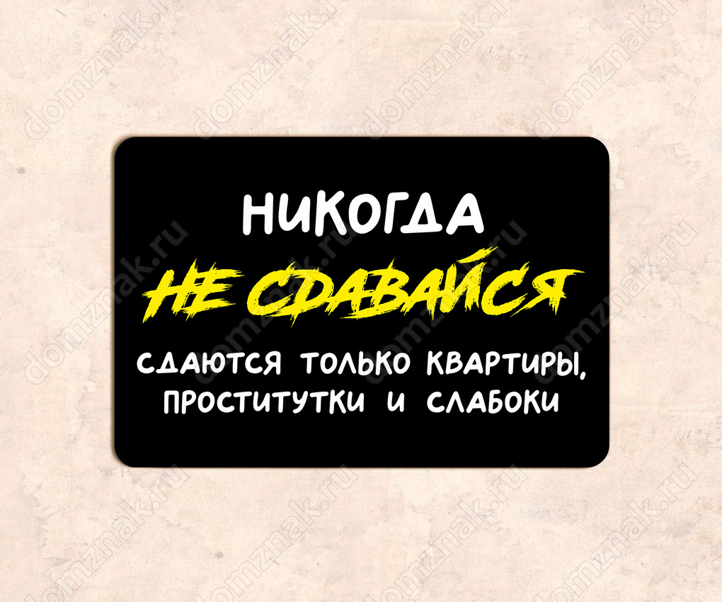 Табличка «Никогда не сдавайся сдаются только квартиры, проститук и и слабоки» изготовлена из пластика ПВХ, толщиной 4 мм. Изображение наносится по технологии УФ-печати. Табличка предназначена для использования как в помещении, так и на улице.